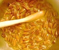 Beat eggs, butter, and sugar together until thick. Add syrup, vanilla, salt, and pecans.